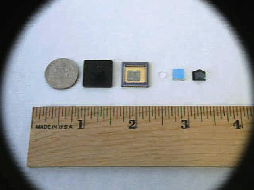 the image we show, from left to right, a dime, the camera, the CMOS chip